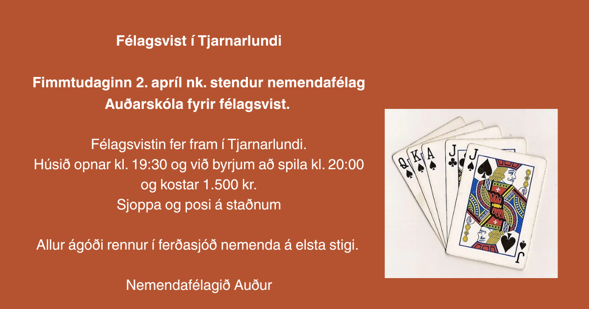 Félagsvist í Tjarnarlundi + Add to Google Calendar + iCal / Outlook export 00 days 00 hours 00 minutes 00 seconds Date 2. apríl, 2026 Time 19:30 - 22:00 Share this event